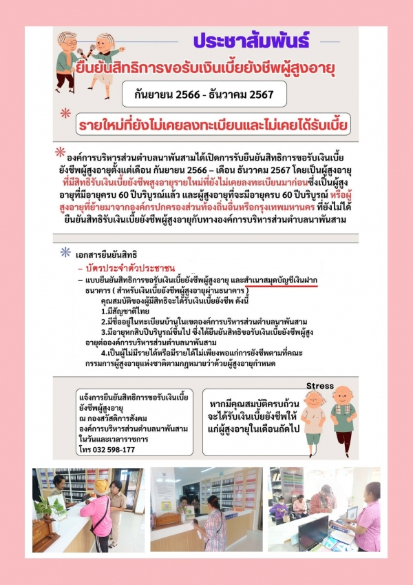 ประชาสัมพันธ์ กองสวัสดิการสังคม เรื่อง การยืนยันสิทธิการขอรับเงินเบี้ยยังชีพ พร้อมเอกสาร 1. บัตรประจำตัวประชาชน 3. ทะเบียนบ้าน (สำหรับผู้ขึ้นทะเบียน ผู้ที่ยืนยันตัวตนไม่ต้องนำมาค่ะ) 2. สมุดบัญชีธนาคาร ได้ทุกธนาคาร ติดต่อ กองสวัสดิการสังคม โทร 032-598-177